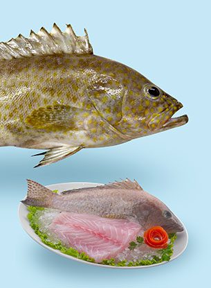 Grouper are members of the seabass family, Serranidae, and are found in tropical and warm temperate waters worldwide. Grouper have unique identifiable characteristics, they are commonly described as lean, moist fish with a distinctive yet mild flavor. The large, white-flaked flesh contains no intramuscular bones. Grouper has white flesh fish with a taste and texture which is popular and distinct from most common white flesh fish. Grouper fillets are usually thick with a firm texture.